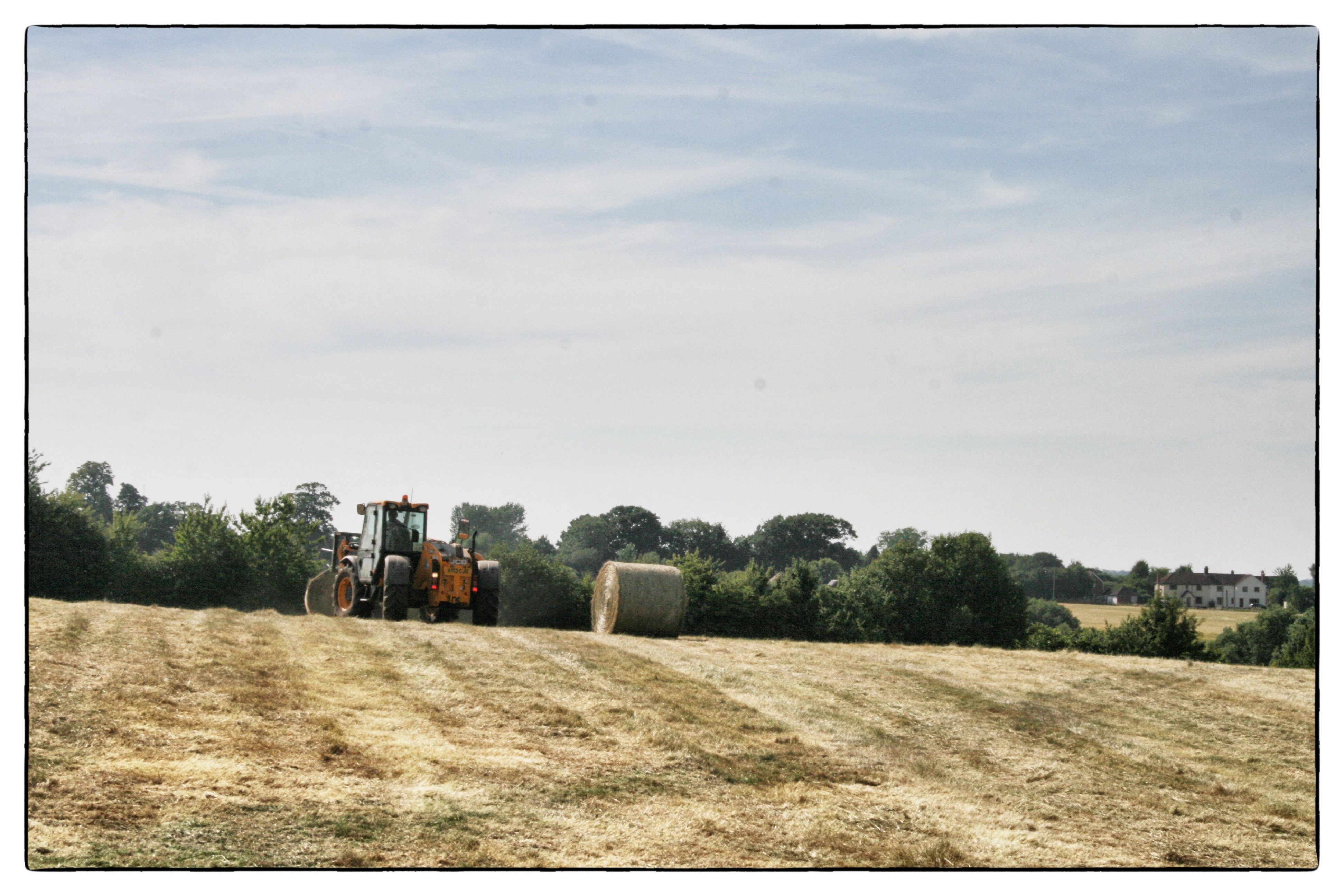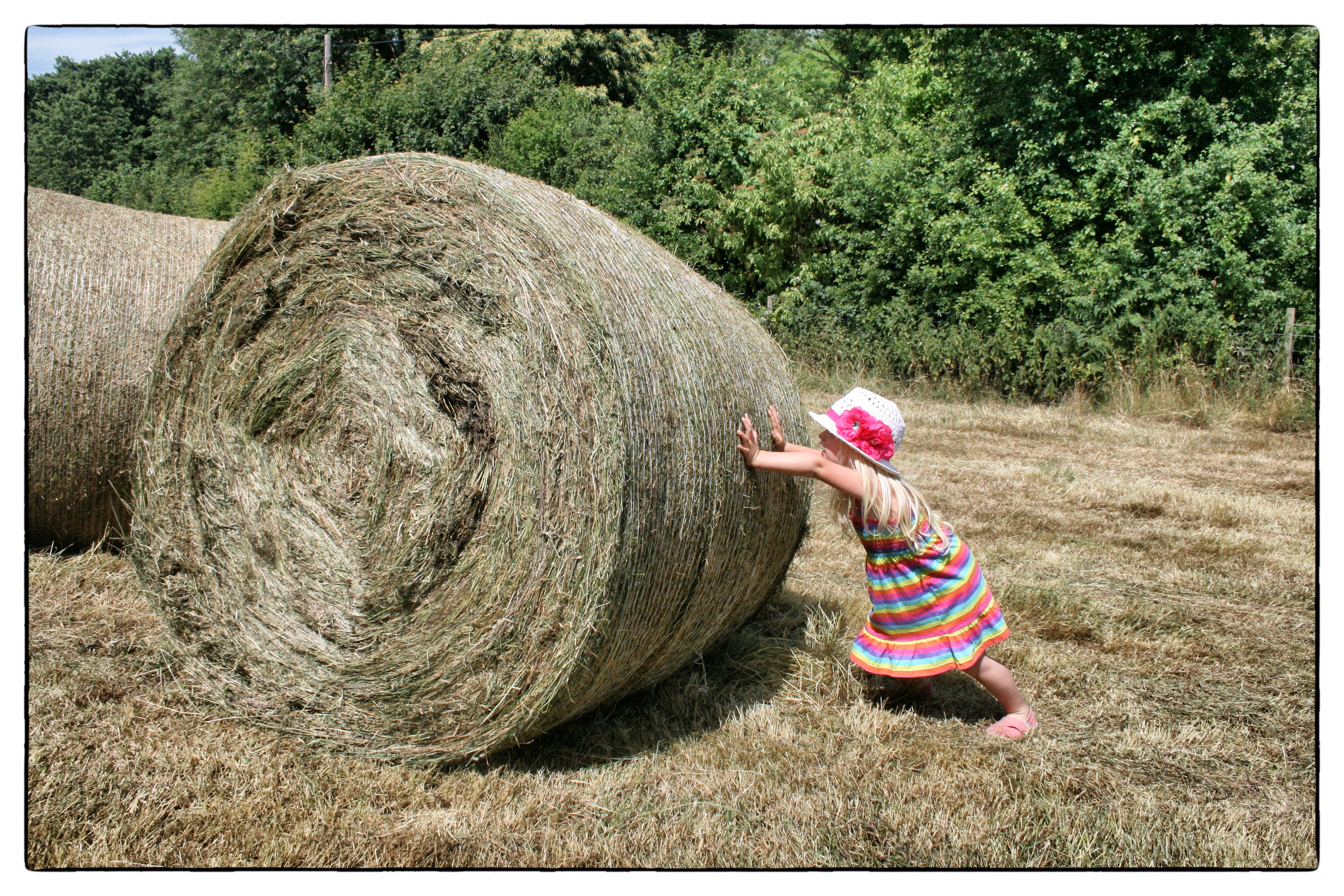We both marveled at the baling machine, that turned the long piles of cut grass into neat, circular bales. And she giggled as the forklift-type machine stabbed the bales, like you stab an olive with a cocktail stick, and moved them onto the back of a trailer.